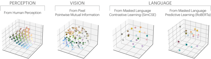 표상수렴 현상의 가장 충격적인 측면은 시각적 경험이나 물리적 접점이 전혀 없는 상태에서도 인간과 유사한 개념적 지형도가 형성된다는 점이다. 2025년 연구들은 오직 텍스트 데이터의 ‘다음 토큰 예측(Next-token prediction)’만으로 학습된 대규모 언어 모델(LLM)이 인간의 인지적, 생물학적 구조와 정렬된 표상을 창발시킨다는 사실을 입증했다.
