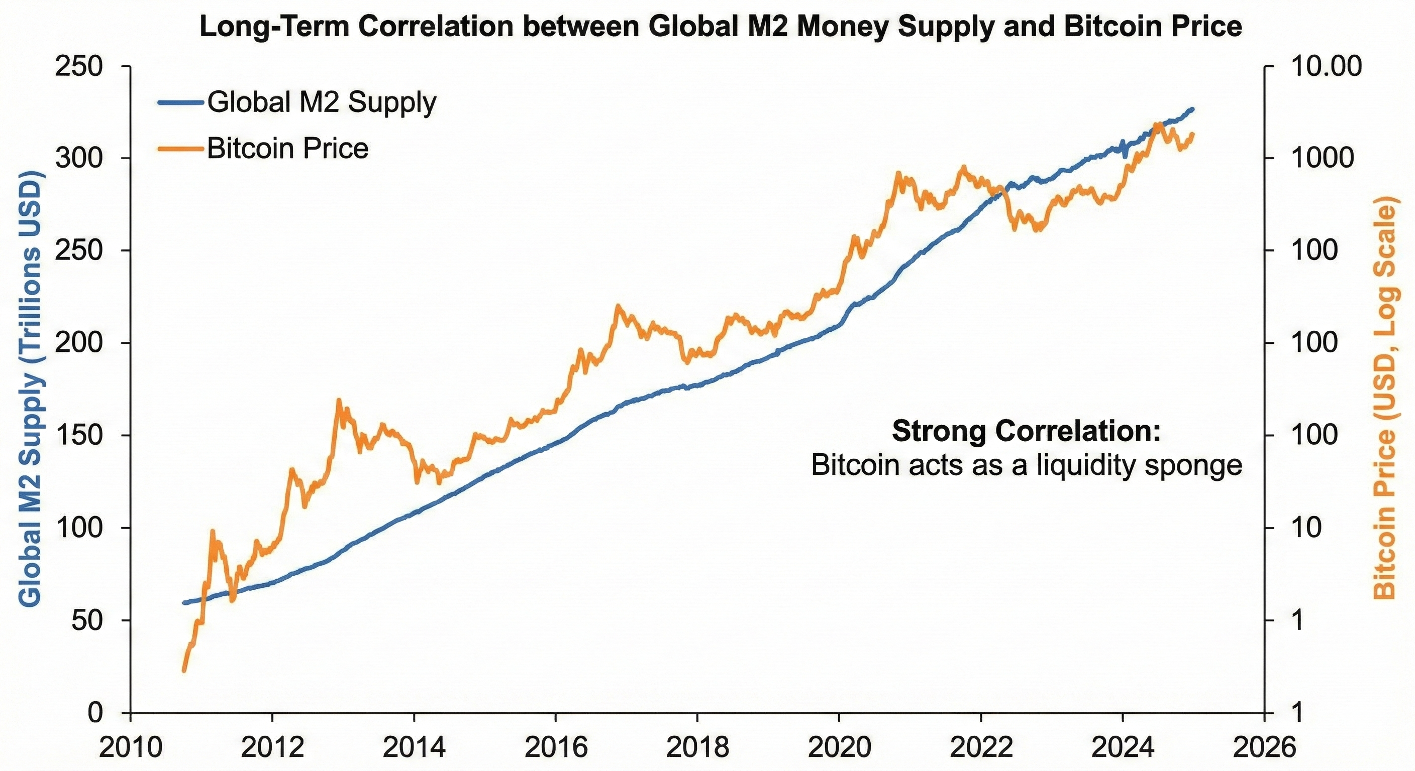 비트코인 가격 변동의 약 54%는 주요국(미국, 유럽, 중국, 일본 등)의 M2 통화량 변화에 의해 설명된다. 즉, 중앙은행이 유동성을 공급하여 법정 화폐의 가치를 희석시킬 때 비트코인은 가장 강력한 ‘유동성 스펀지’ 역할을 수행한다.