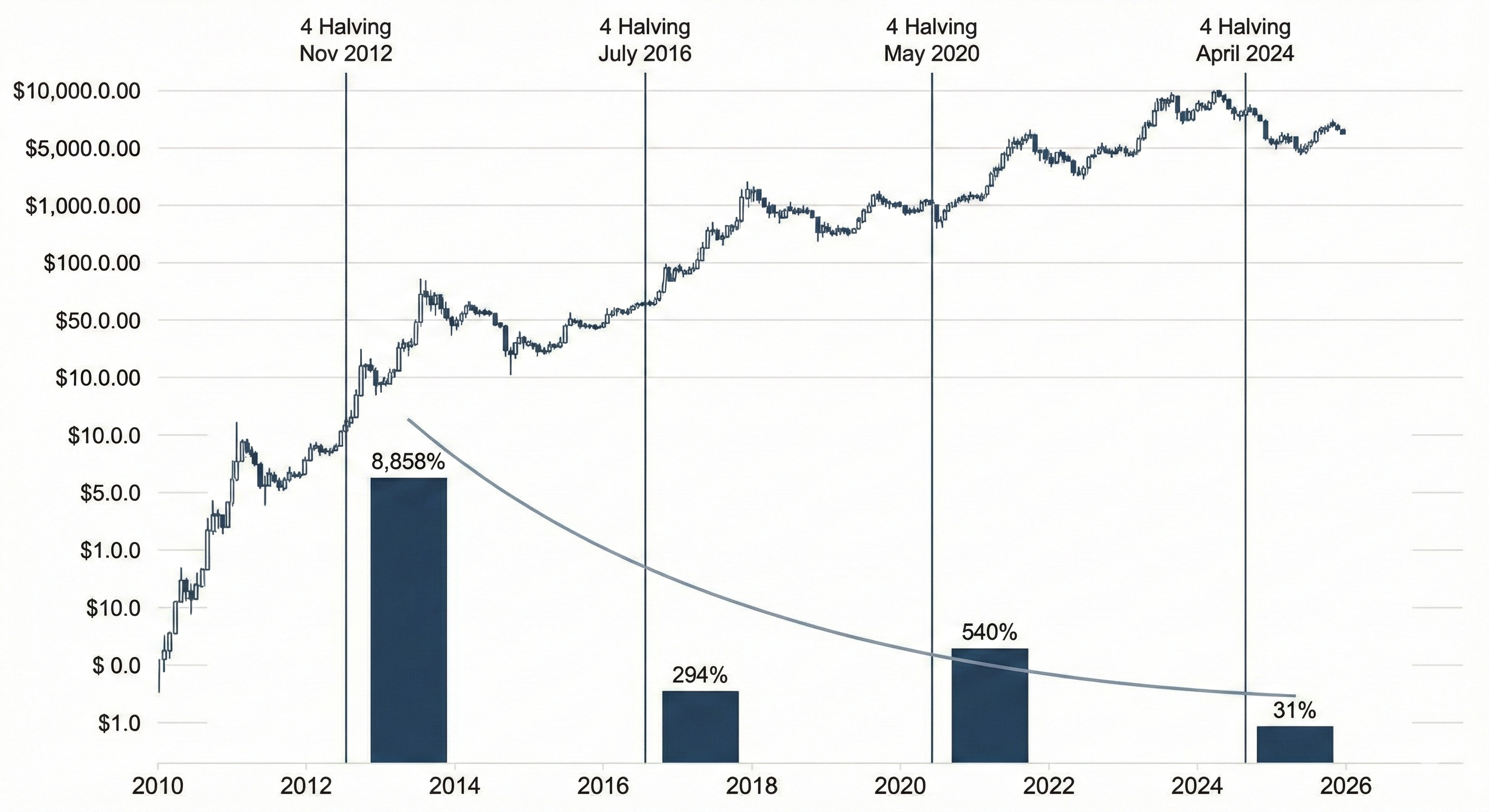 비트코인은 역사적으로 반감기를 기점으로 뚜렷한 4년 주기(Four-year Cycle)를 보여왔다. 반감기 이후 약 12개월에서 18개월 사이에 공급 부족 현상이 시장에 반영되며 가격이 기하급수적으로 상승하는 패턴이 반복되었다.