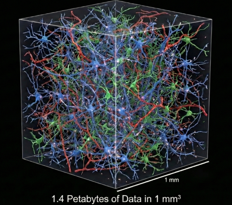 최근 하버드 대학교와 구글 연구팀이 발표한 인간 대뇌 피질 $1\text{ mm}^3$조각의 재구성은 마이크로 커넥토믹스의 새로운 이정표를 세웠다. 이 작은 샘플은 쌀알 절반 크기에도 미치지 못하지만, 이를 분석하는 과정에서 발생한 데이터의 양은 현대 정보통신 기술의 한계를 시험하고 있다.