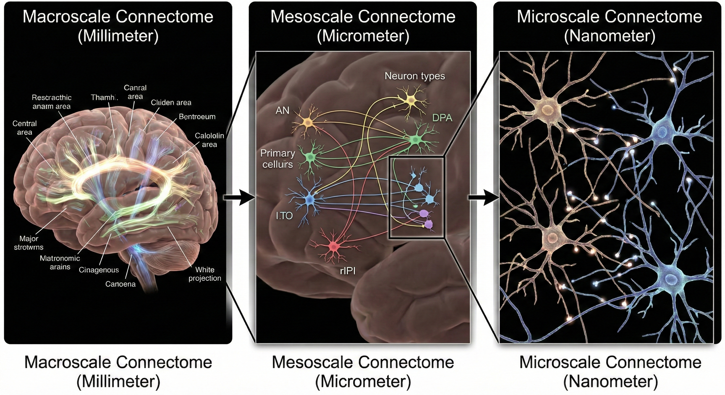 마이크로스케일(Microscale) 커넥톰은 개별 뉴런과 그들 사이의 시냅스 연결을 직접적으로 매핑하며, 나노미터 단위의 해상도를 요구한다. 이는 주로 전자 현미경(EM)과 연속 절편 분석을 통해 수행되며, 예쁜꼬마선충(C. elegans)과 같은 소형 유기체에서는 이미 전체 신경망 지도가 완성된 상태이다. 메조스케일(Mesoscale)은 이들 사이의 중간 단계로, 특정 유형의 뉴런 집단이 형성하는 국소적 및 투사 연결을 체계적으로 매핑한다. 2026년 현재, 바이러스 트레이싱 기술과 뇌 투명화 기술의 발전으로 쥐 뇌의 메조스케일 지도가 고도화되고 있으며, 이는 인간 뇌의 복잡성을 이해하기 위한 가교 역할을 하고 있다.