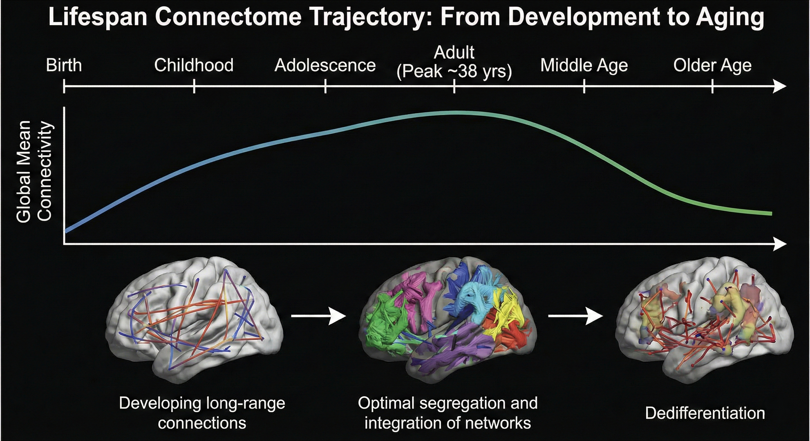 인간의 커넥톰은 태아기부터 노년기에 이르기까지 끊임없는 성숙과 쇠퇴의 과정을 거친다. 2025년 8월에 발표된 33,250명의 기능적 및 구조적 MRI 데이터 분석 결과는 인간 뇌 발달에 대한 가장 정교한 규범적 차트(Normative Chart)를 제공한다.