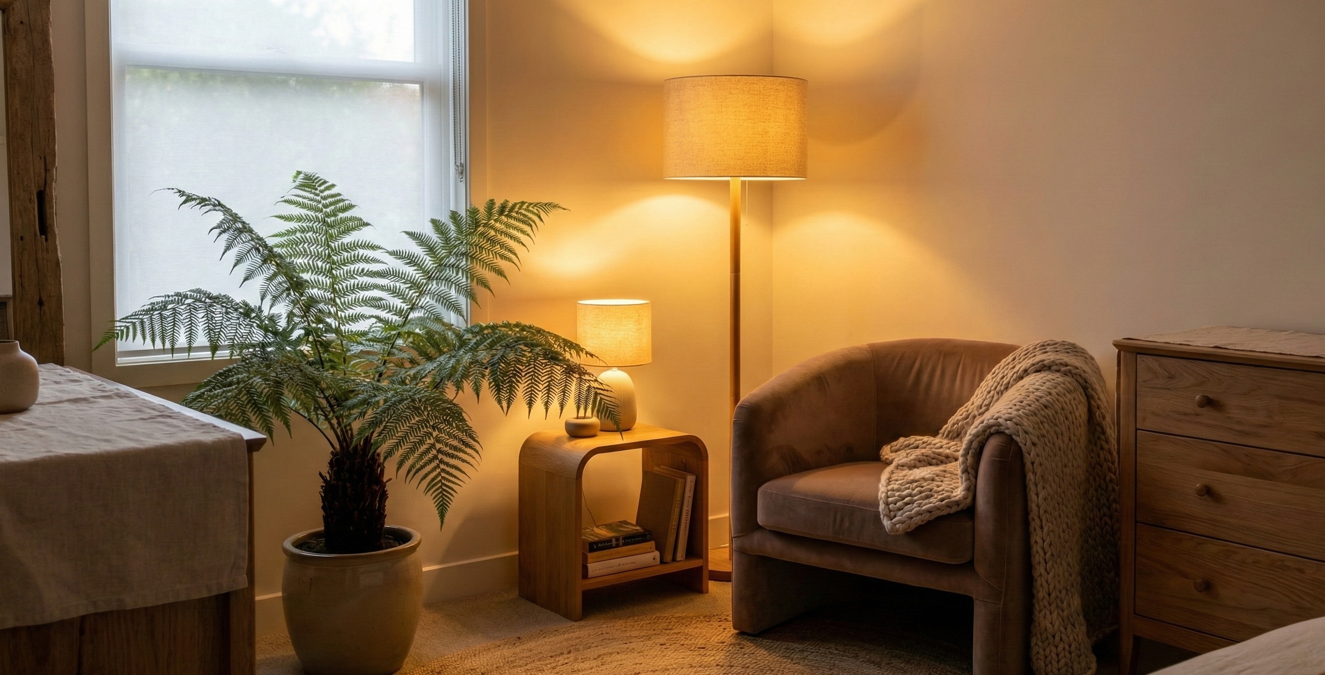 천장의 밝은 형광등 하나만 켜두는 것은 뇌를 피로하게 합니다. 낮에는 창가에서 자연광을 충분히 받고, 해가 진 뒤에는 눈높이보다 낮은 곳에 여러 개의 간접 조명을 배치하세요. 3000K 이하의 따뜻한 빛은 뇌에 "이제 쉴 시간이야"라는 신호를 보냅니다.